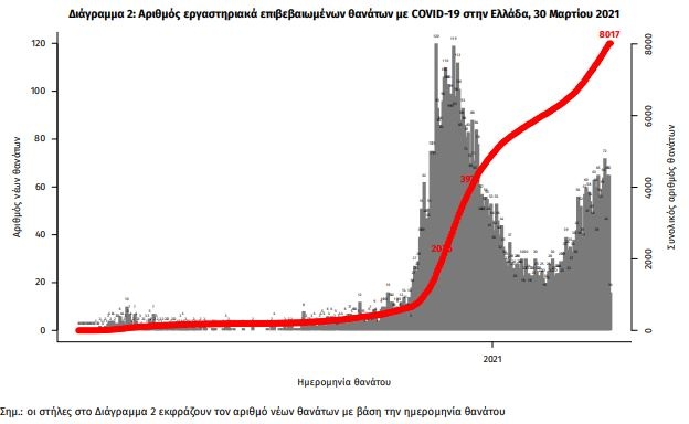 Η διαχρονική εξέλιξη των συνολικών κρουσμάτων και συνολικού αριθμού των θανάτων ασθενών COVID-19 παρουσιάζεται στο ακόλουθο διάγραμμα.