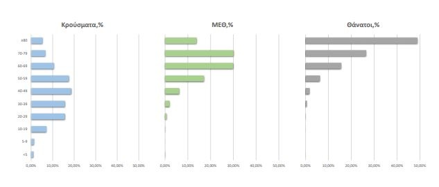 Ακολούθως παρουσιάζεται η ηλικιακή κατανομή των (α) συνολικών κρουσμάτων, (β) των περιστατικών που κατέληξαν σε θάνατο και (γ) των ασθενών που νοσηλεύονται διασωληνωμένοι: