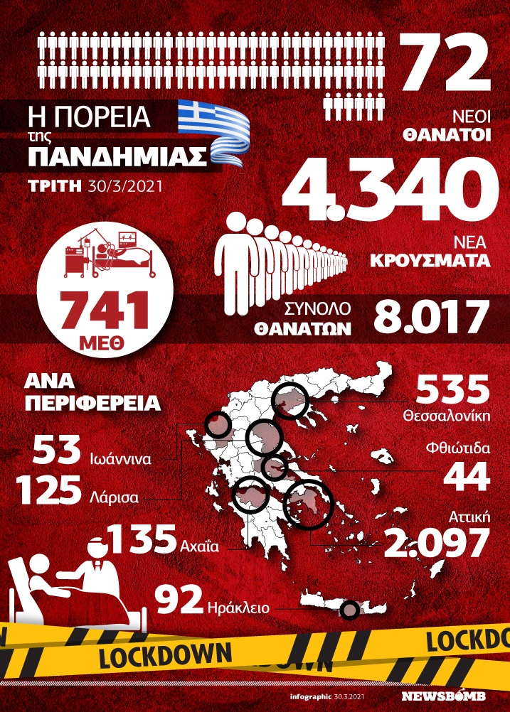 Το τρίτο κύμα του κορονοϊού να αποδεικνύεται το χειρότερο όλων, με τα κρούσματα την Τρίτη 30/03/2021 να φτάνουν τις 4.340, αριθμό ρεκόρ για τα δεδομένα της χώρας μας.