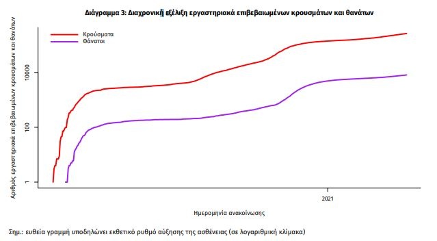 Η διαχρονική εξέλιξη των συνολικών κρουσμάτων και συνολικού αριθμού των θανάτων ασθενών COVID-19 παρουσιάζεται στο ακόλουθο διάγραμμα.