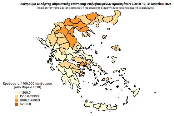 Η γεωγραφική κατανομή των 3.616 νέων κρουσμάτων Covid-19 που ανακοίνωσε την Τετάρτη (31/3) ο ΕΟΔΥ έχει ως εξής