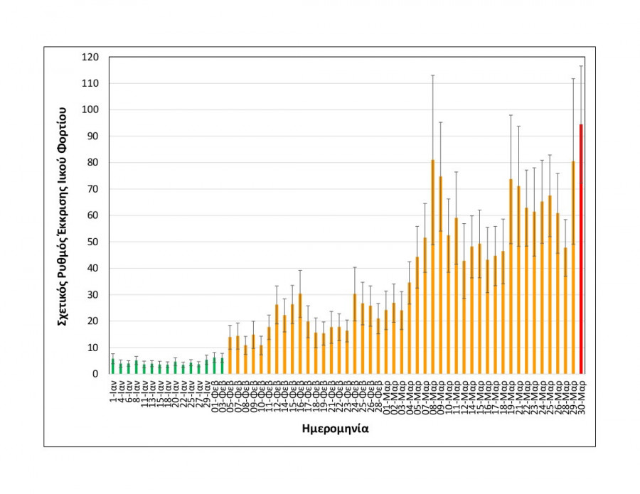 - Αυξημένη κατά 61% σε σχέση με τη μέση τιμή των δύο αμέσως προηγούμενων μετρήσεων, της Παρασκευής 26/3 και της Κυριακής 28/3.