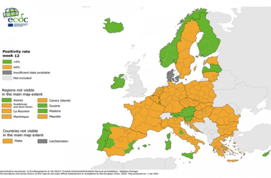 Δημοσιεύτηκαν από το Ευρωπαϊκό Κέντρο Πρόληψης και Ελέγχου Νόσων (ECDC) οι έγχρωμοι χάρτες που αποτυπώνουν την επιδημιολογική εικόνα στα κράτη μέλη της ΕΕ