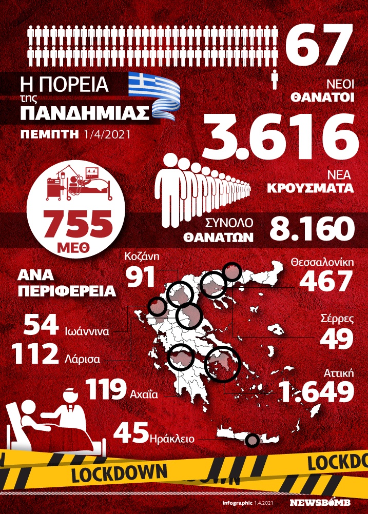 Την Πέμπτη (01.04) καταγράφηκαν 3.491 νέα κρούσματα κορονοϊού στη χώρα, ενώ ο αριθμός των διασωληνωμένων ανέβηκε στους 755 καταγράφοντας ένα ακόμα αρνητικό ρεκόρ. Επιπλέον, άλλοι 67 άνθρωποι έχασαν τη ζωή τους λόγω της φονικής νόσου.