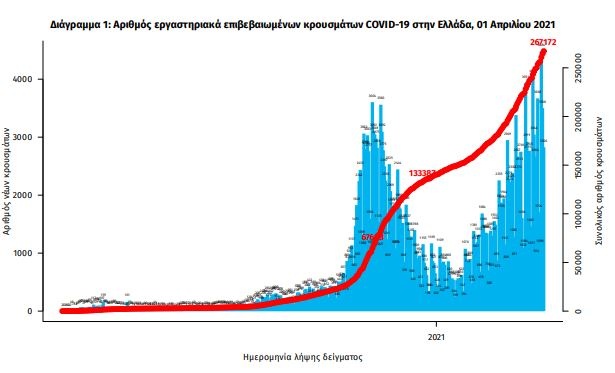 Κορονοϊός - Όλες οι ειδήσεις: Την Πέμπτη, 1η Απριλίου 2021, ο ΕΟΔΥ ανακοίνωσε 3.491 νέα κρούσματα του νέου ιού στη χώρα, εκ των οποίων τα 10 εντοπίστηκαν κατόπιν ελέγχων στις πύλες εισόδου της χώρας.