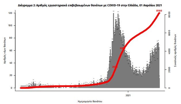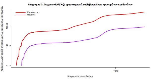 Η διαχρονική εξέλιξη των συνολικών κρουσμάτων και συνολικού αριθμού των θανάτων ασθενών COVID-19 παρουσιάζεται στο ακόλουθο διάγραμμα.