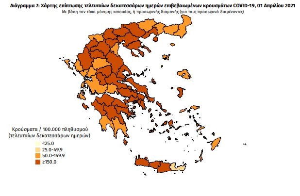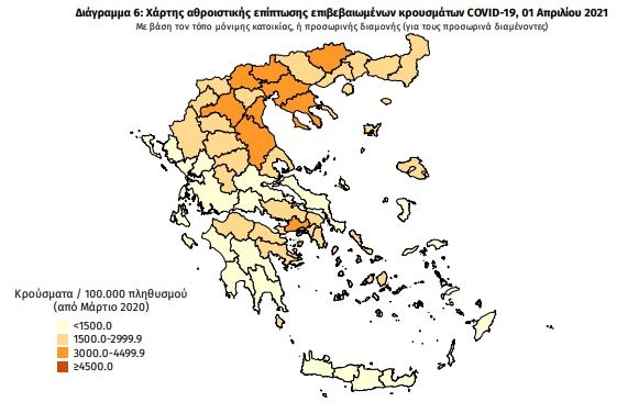 Η γεωγραφική κατανομή των 3.491 νέων κρουσμάτων Covid-19 που ανακοίνωσε την Πέμπτη (1/4) ο ΕΟΔΥ έχει ως εξής