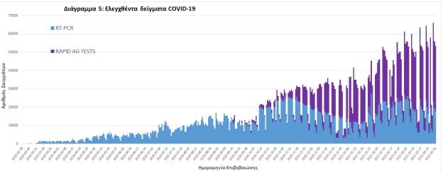 Από την 1η Ιανουαρίου 2020 μέχρι σήμερα, στα εργαστήρια που διενεργούν ελέγχους για τον νέο κοoωνοϊό (SARS-CoV-2) και που δηλώνουν συστηματικά το σύνολο των δειγμάτων που ελέγχουν, έχουν συνολικά ελεγχθεί 4.188.841 κλινικά δείγματα ενώ από Μονάδες Υγείας και Κλιμάκια του ΕΟΔΥ που διενεργούν ελέγχους Rapid Ag έχουν ελεγχθεί 2.400.363 δείγματα.