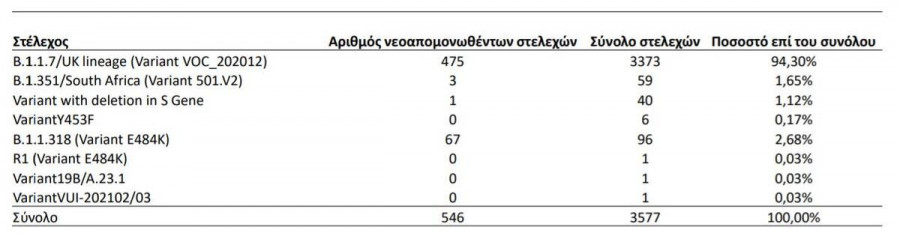 Από τα 478 δείγματα με στελέχη VOC, τα 475 βρέθηκαν με τη μετάλλαξη Β.1.1.7/UK lineage (Variant VOC_202012) και τρία δείγματα με τη μετάλλαξη Lineage B.1.351/South Africa (Variant 501.V2), ενώ και τα 67 δείγματα με στελέχη VUI αφορούσαν το στέλεχος B.1.1.318 (Variant_E484K) (Πίνακας 3).