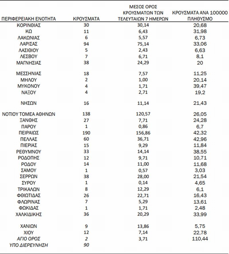 Ανησυχία υπάρχει και για άλλες μεγάλες περιφέρειες, καθώς στην Αχαΐα εντοπίστηκαν 141 κρούσματα, ενώ στη Λάρισα καταγράφηκαν 94, όσα και στην Κοζάνη.