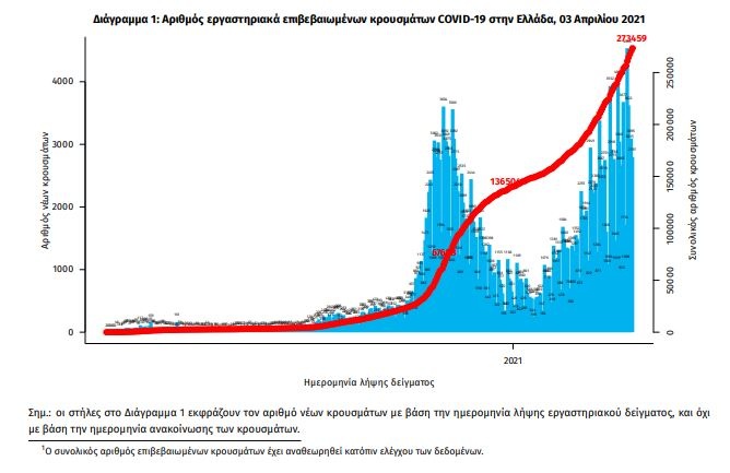 Τα νέα εργαστηριακά επιβεβαιωμένα κρούσματα της νόσου που καταγράφηκαν τις τελευταίες 24 ώρες είναι 3.232, εκ των οποίων 4 εντοπίστηκαν κατόπιν ελέγχων στις πύλες εισόδου της χώρας. Ο συνολικός αριθμός των κρουσμάτων ανέρχεται σε 273.459 (ημερήσια μεταβολή +1.2%), εκ των οποίων 51.5% άνδρες.