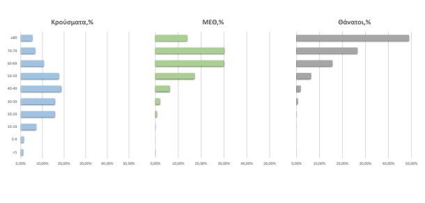 Διάγραμμα 4: Ηλικιακή Κατανομή κρουσμάτων, νοσηλευόμενων στις MEΘ και ασθενών που απεβίωσαν από την αρχή της πανδημίας.
