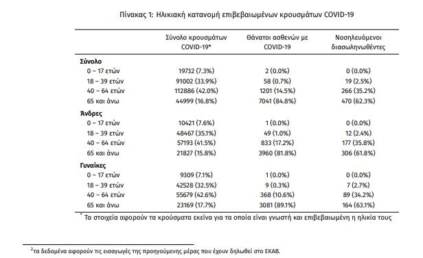 Οι νέοι θάνατοι ασθενών με COVID-19 είναι 70, ενώ από την έναρξη της επιδημίας έχουν καταγραφεί συνολικά 8.302 θάνατοι. Το 95.7% είχε υποκείμενο νόσημα ή/και ηλικία 70 ετών και άνω.