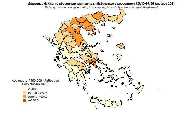 Γεωγραφική διασπορά: Ο χάρτης αποτυπώνει τη γεωγραφική κατανομή των συνολικών κρουσμάτων COVID-19 (από την αρχή της επιδημίας) ανά Περιφερειακή Ενότητα της χώρας, με βάση την δηλωθείσα διεύθυνση μόνιμης κατοικίας του ασθενούς, ή τη διεύθυνση προσωρινής διαμονής για τους τουρίστες και άλλους προσωρινά διαμένοντες στην Ελλάδα.
