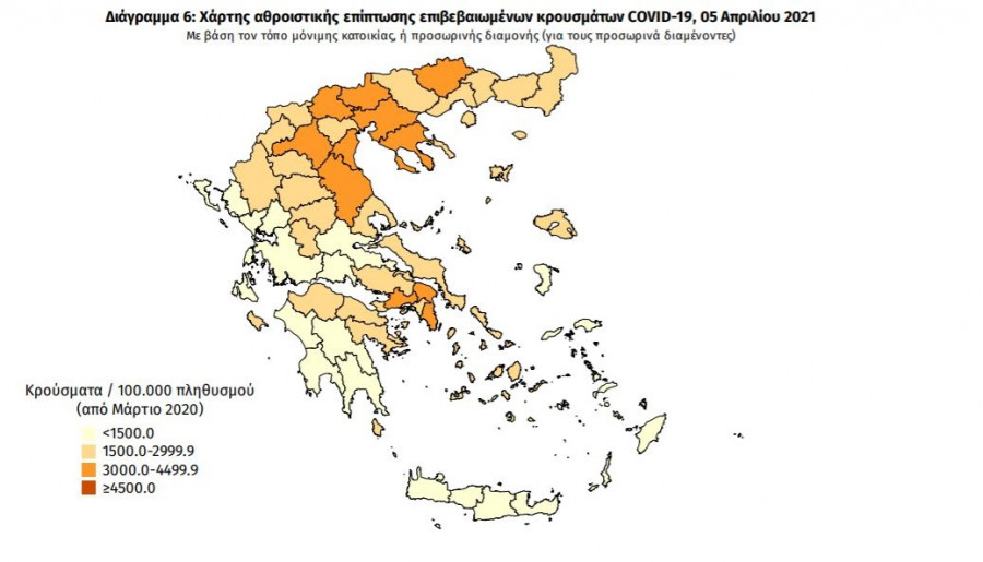 Γεωγραφική διασπορά: Ο χάρτης αποτυπώνει τη γεωγραφική κατανομή των συνολικών κρουσμάτων COVID-19 (από την αρχή της επιδημίας) ανά Περιφερειακή Ενότητα της χώρας, με βάση την δηλωθείσα διεύθυνση μόνιμης κατοικίας του ασθενούς, ή τη διεύθυνση προσωρινής διαμονής για τους τουρίστες και άλλους προσωρινά διαμένοντες στην Ελλάδα. Συμπεριλαμβάνονται τόσο κρούσματα με ιστορικό ταξιδίου (“εισαγόμενα”) όσο και κρούσματα με πιθανή εγχώρια μετάδοση.