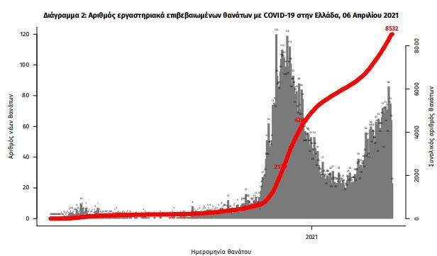 Η διαχρονική εξέλιξη των συνολικών κρουσμάτων και συνολικού αριθμού των θανάτων ασθενών COVID-19 παρουσιάζεται στο ακόλουθο διάγραμμα.