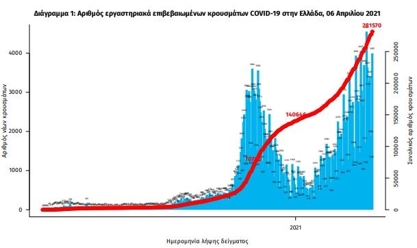 Κορονοϊός - Όλες οι ειδήσεις: Την Τρίτη, 6 Απριλίου 2021, ο ΕΟΔΥ ανακοίνωσε 4.309 νέα κρούσματα του νέου ιού στη χώρα, εκ των οποίων τα 30 εντοπίστηκαν κατόπιν ελέγχων στις πύλες εισόδου της χώρας.