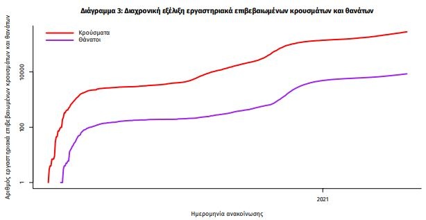 Η διαχρονική εξέλιξη των συνολικών κρουσμάτων και συνολικού αριθμού των θανάτων ασθενών COVID-19 παρουσιάζεται στο ακόλουθο διάγραμμα.
