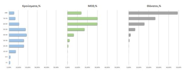 Ηλικιακή Κατανομή κρουσμάτων, νοσηλευόμενων στις MEΘ και ασθενών που απεβίωσαν από την αρχή της πανδημίας.