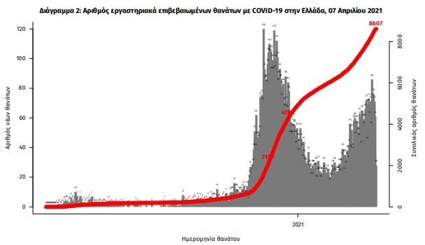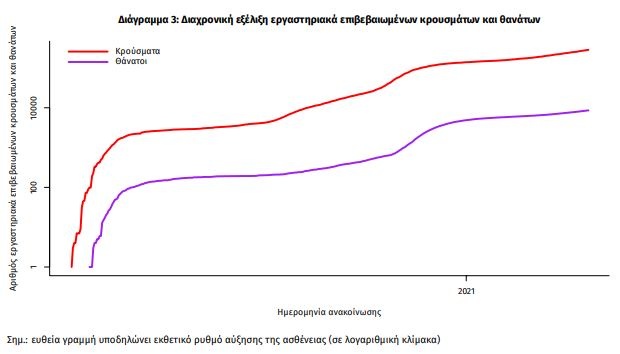 Η διαχρονική εξέλιξη των συνολικών κρουσμάτων και συνολικού αριθμού των θανάτων ασθενών COVID-19 παρουσιάζεται στο ακόλουθο διάγραμμα.