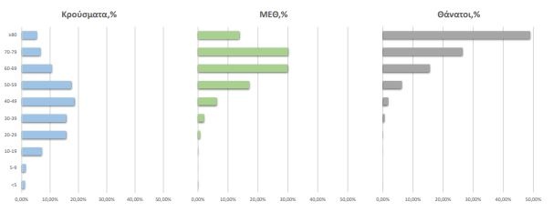 Ηλικιακή Κατανομή κρουσμάτων, νοσηλευόμενων στις MEΘ και ασθενών που απεβίωσαν από την αρχή της πανδημίας