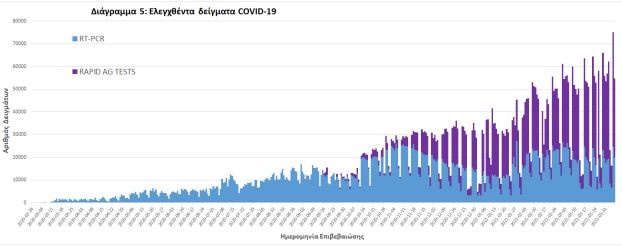 Από την 1η Ιανουαρίου 2020 μέχρι σήμερα, στα εργαστήρια που διενεργούν ελέγχους για τον νέο κορoνοϊό (SARS-CoV-2) και που δηλώνουν συστηματικά το σύνολο των δειγμάτων που ελέγχουν, έχουν συνολικά ελεγχθεί 4.287.306 κλινικά δείγματα ενώ από Μονάδες Υγείας και Κλιμάκια του ΕΟΔΥ που διενεργούν ελέγχους Rapid Ag έχουν ελεγχθεί 2.590.909 δείγματα.