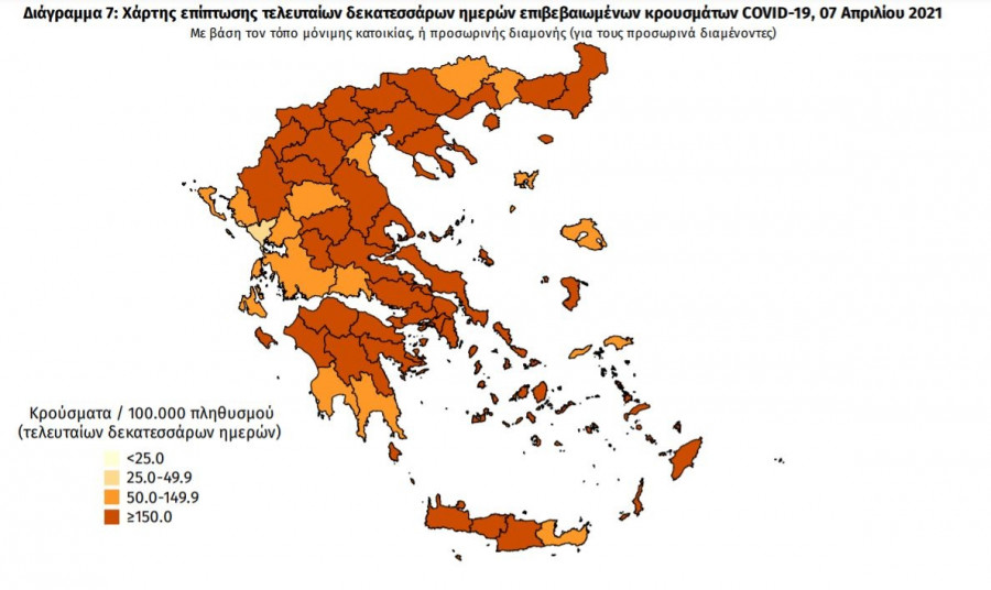 Η γεωγραφική κατανομή των 3.445 νέων κρουσμάτων Covid-19 που ανακοίνωσε την Τετάρτη (7/4) ο ΕΟΔΥ έχει ως εξής