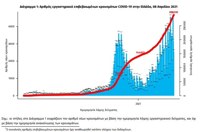 Δείγματα που έχουν ελεγχθεί: Από την 1η Ιανουαρίου 2020 μέχρι σήμερα, στα εργαστήρια που διενεργούν ελέγχους για τον νέο κορονοϊό (SARS-CoV-2) και που δηλώνουν συστηματικά το σύνολο των δειγμάτων που ελέγχουν, έχουν συνολικά ελεγχθεί 4.305.364 κλινικά δείγματα ενώ από Μονάδες Υγείας και Κλιμάκια του ΕΟΔΥ που διενεργούν ελέγχους Rapid Ag έχουν ελεγχθεί 2.631.307 δείγματα. O μέσος όρος του επταημέρου είναι 47.717 δειγματοληπτικοί έλεγχοι.