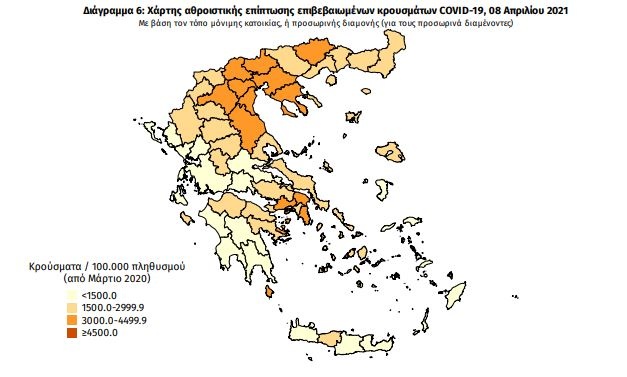 Γεωγραφική διασπορά: Ο χάρτης αποτυπώνει τη γεωγραφική κατανομή των συνολικών κρουσμάτων COVID-19 (από την αρχή της επιδημίας) ανά Περιφερειακή Ενότητα της χώρας, με βάση την δηλωθείσα διεύθυνση μόνιμης κατοικίας του ασθενούς, ή τη διεύθυνση προσωρινής διαμονής για τους τουρίστες και άλλους προσωρινά διαμένοντες στην Ελλάδα.