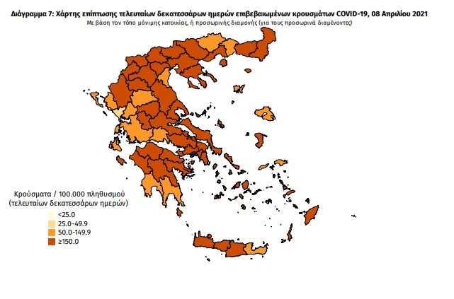 Οι νέοι θάνατοι ασθενών με COVID-19 είναι 73, ενώ από την έναρξη της επιδημίας έχουν καταγραφεί συνολικά 8.680 θάνατοι. Το 95.6% είχε υποκείμενο νόσημα ή/και ηλικία 70 ετών και άνω.
