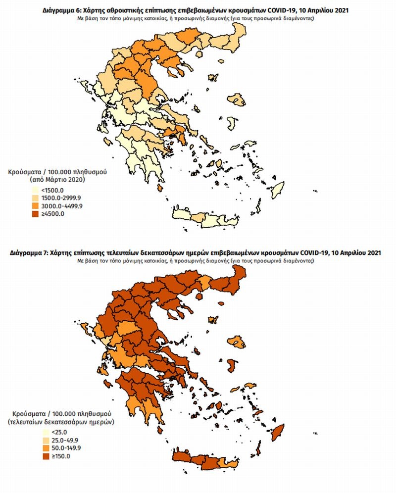 Ημερήσιος αριθμός και κρούσματα ανά 100.000 πληθυσμού επιβεβαιωμένων εγχώριων κρουσμάτων COVID-19 ανά περιφερειακή ενότητα στις 10 Απριλίου 2021