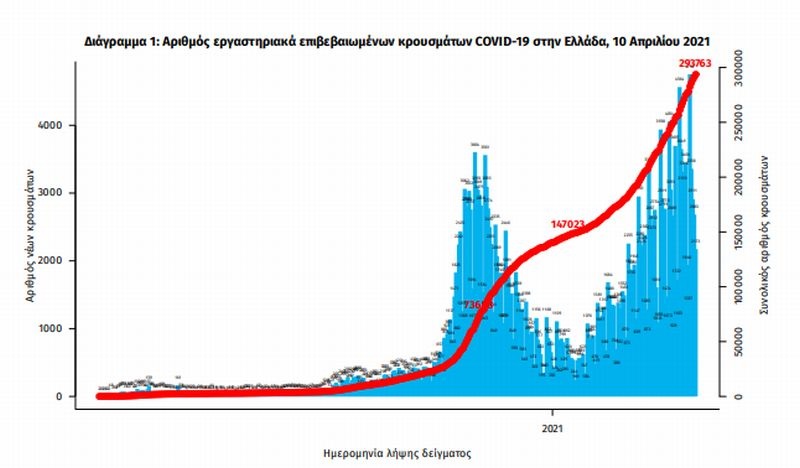 Συγκεκριμένα, τα νέα εργαστηριακά επιβεβαιωμένα κρούσματα της νόσου που καταγράφηκαν τις τελευταίες 24 ώρες είναι 2.801, εκ των οποίων 4 εντοπίστηκαν κατόπιν ελέγχων στις πύλες εισόδου της χώρας. Ο συνολικός αριθμός των κρουσμάτων ανέρχεται σε 293.763 (ημερήσια μεταβολή +1.0%), εκ των οποίων 51.4% άνδρες.