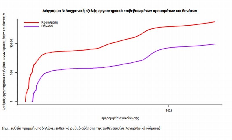 Η διαχρονική εξέλιξη των συνολικών κρουσμάτων και συνολικού αριθμού των θανάτων ασθενών COVID-19 παρουσιάζεται στο ακόλουθο διάγραμμα.