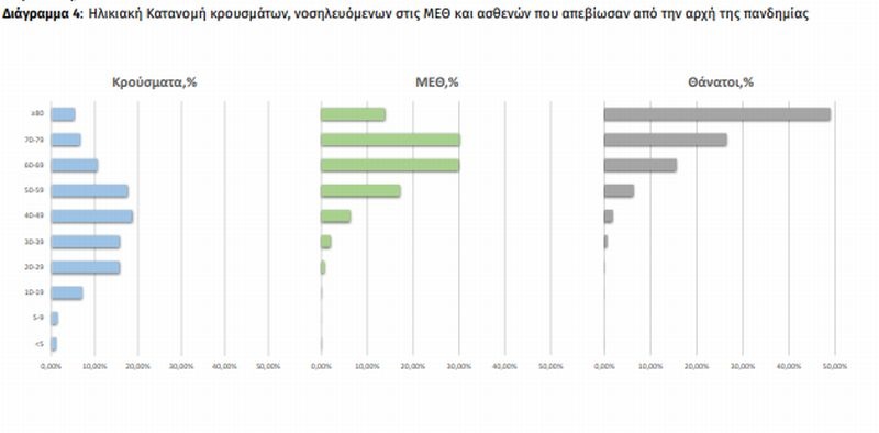 Ακολούθως παρουσιάζεται η ηλικιακή κατανομή των (α) συνολικών κρουσμάτων, (β) των περιστατικών που κατέληξαν σε θάνατο και (γ) των ασθενών που νοσηλεύονται διασωληνωμένοι:
