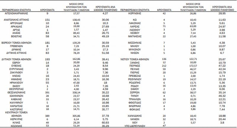 Από το σύνολο των 2.801 νέων κρουσμάτων του νέου ιού στη χώρα 4 είναι εισαγόμενα εκ των οποίων 4 εντοπίστηκαν κατόπιν ελέγχων στις πύλες εισόδου της χώρας. Η κατανομή των 2.797 νέων εγχώριων κρουσμάτων ανά Περιφερειακή Ενότητα παρουσιάζεται στον κατωτέρω πίνακα.