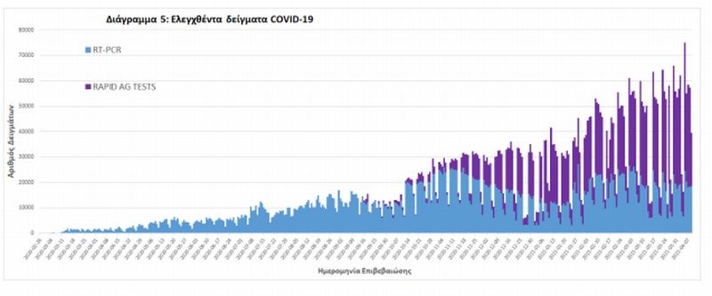 Από την 1η Ιανουαρίου 2020 μέχρι σήμερα, στα εργαστήρια που διενεργούν ελέγχους για τον νέο κορονοϊό (SARS-CoV-2) και που δηλώνουν συστηματικά το σύνολο των δειγμάτων που ελέγχουν, έχουν συνολικά ελεγχθεί 4.342.220 κλινικά δείγματα ενώ από Μονάδες Υγείας και Κλιμάκια του ΕΟΔΥ που διενεργούν ελέγχους Rapid Ag έχουν ελεγχθεί 2.691.374 δείγματα. O μέσος όρος του επταημέρου είναι 46.481 δειγματοληπτικοί έλεγχοι.
