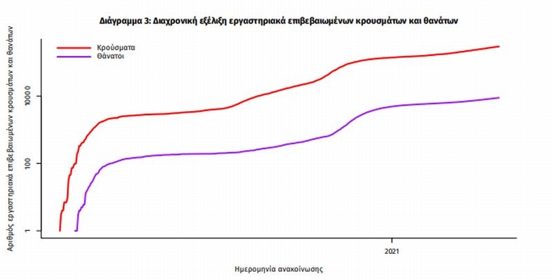 Η διαχρονική εξέλιξη των συνολικών κρουσμάτων και συνολικού αριθμού των θανάτων ασθενών COVID-19 παρουσιάζεται στο ακόλουθο διάγραμμα.