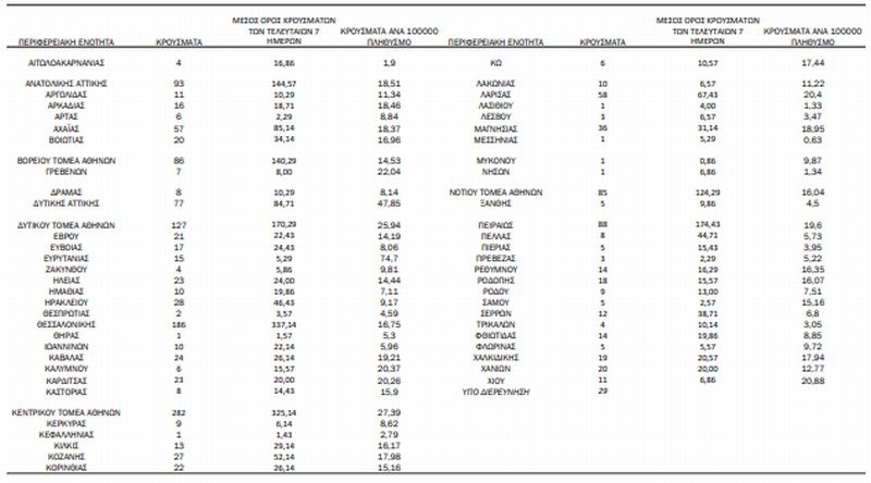 Από το σύνολο των 1.718 νέων κρουσμάτων του νέου ιού στη χώρα 3 είναι εισαγόμενα εκ των οποίων 3 εντοπίστηκαν κατόπιν ελέγχων στις πύλες εισόδου της χώρας. Η κατανομή των 1.715 νέων εγχώριων κρουσμάτων ανά Περιφερειακή Ενότητα παρουσιάζεται στον κατωτέρω πίνακα.