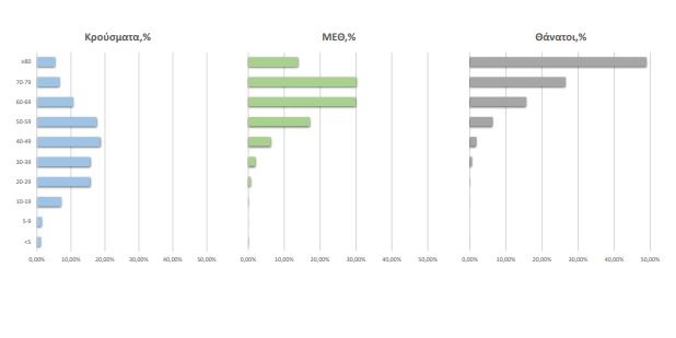 Διάγραμμα 4: Ηλικιακή Κατανομή κρουσμάτων, νοσηλευόμενων στις MEΘ και ασθενών που απεβίωσαν από την αρχή της πανδημίας.