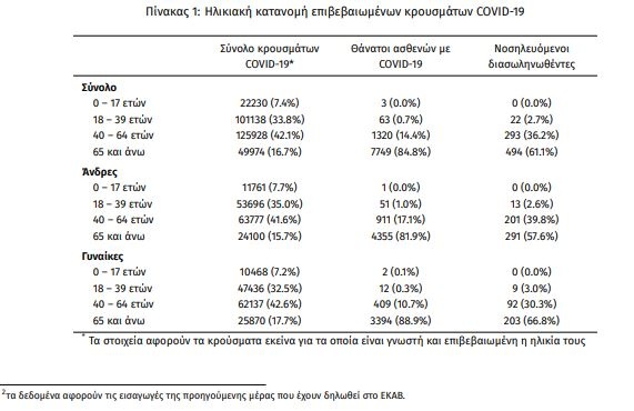 Οι νέοι θάνατοι ασθενών με COVID-19 είναι 81, ενώ από την έναρξη της επιδημίας έχουν καταγραφεί συνολικά 9.135 θάνατοι. Το 95.5% είχε υποκείμενο νόσημα ή/και ηλικία 70 ετών και άνω.