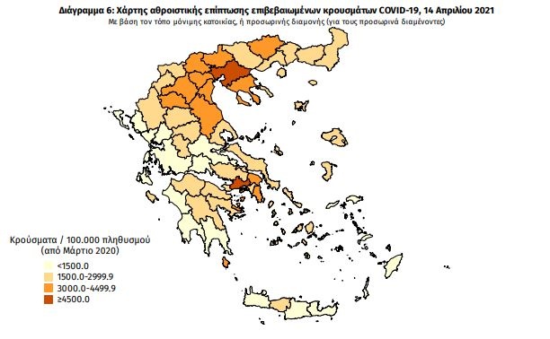Γεωγραφική διασπορά: Ο χάρτης αποτυπώνει τη γεωγραφική κατανομή των συνολικών κρουσμάτων COVID-19 (από την αρχή της επιδημίας) ανά Περιφερειακή Ενότητα της χώρας, με βάση την δηλωθείσα διεύθυνση μόνιμης κατοικίας του ασθενούς, ή τη διεύθυνση προσωρινής διαμονής για τους τουρίστες και άλλους προσωρινά διαμένοντες στην Ελλάδα.
