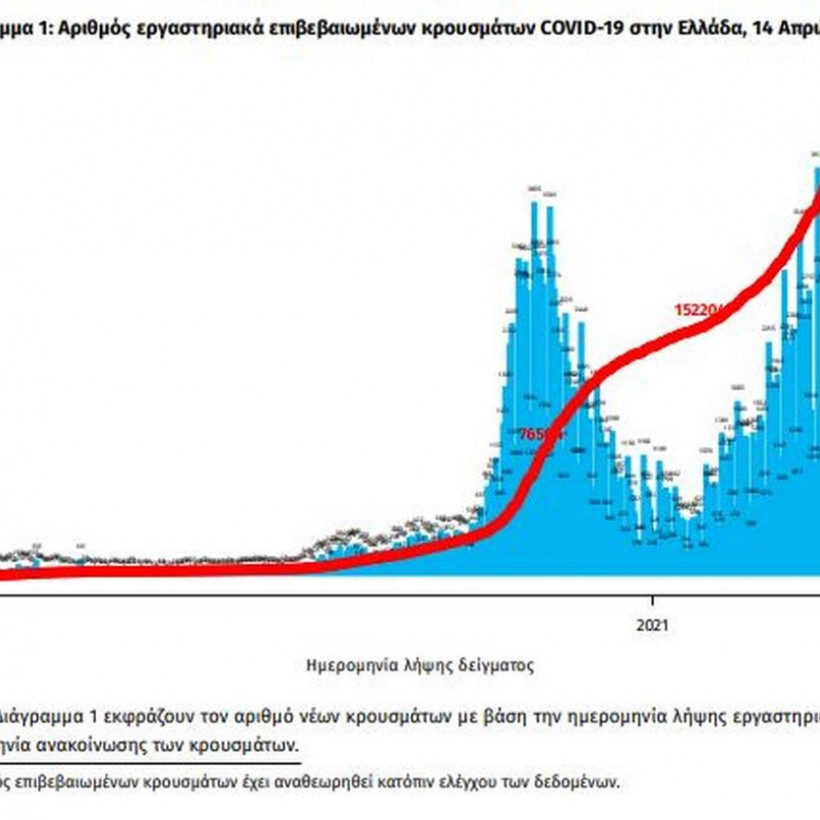 Σύμφωνα με τα τελευταία στοιχεία, ο ΕΟΔΥ ανακοίνωσε σήμερα, Τετάρτη 14 Απριλίου τα νέα εργαστηριακά επιβεβαιωμένα κρούσματα της νόσου που καταγράφηκαν τις τελευταίες 24 ώρες είναι 3.089, εκ των οποίων 12 εντοπίστηκαν κατόπιν ελέγχων στις πύλες εισόδου της χώρας. Ο συνολικός αριθμός των κρουσμάτων ανέρχεται σε 304.184 (ημερήσια μεταβολή +1.0%), εκ των οποίων 51.3% άνδρες.