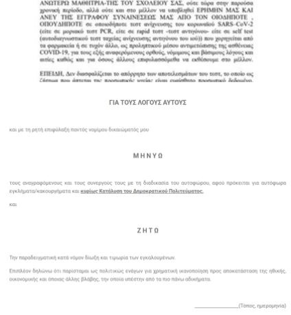 Όπως αναφέρει το grtimes.gr, με την επανέναρξη των μαθημάτων στα Λύκεια υπό το καθεστώς των self test, υπήρξαν περιπτώσεις γονέων τόσο στον Εύοσμο Θεσσαλονίκης όσο στο Ρέθυμνο και αλλού, που κινήθηκαν με μηνύσεις εναντίον εκπαιδευτικών, επειδή δεν επέτρεψαν την είσοδο στα παιδιά τους χωρίς τη σχετική βεβαίωση με το αποτέλεσμα του self test.