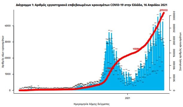 Σύμφωνα με τα δεδομένα που δηλώθηκαν στον ΕΟΔΥ και καταγράφηκαν μέχρι τις 16 Απριλίου 2021 (ώρα 15:00), τα νέα εργαστηριακά επιβεβαιωμένα κρούσματα κορονοϊού που καταγράφηκαν τις τελευταίες 24 ώρες είναι 3.067, εκ των οποίων 13 εντοπίστηκαν κατόπιν ελέγχων στις πύλες εισόδου της χώρας.