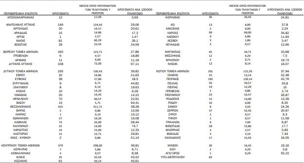 Από το σύνολο των 3.067 νέων κρουσμάτων του νέου ιού στη χώρα 15 είναι εισαγόμενα εκ των οποίων 13 εντοπίστηκαν κατόπιν ελέγχων στις πύλες εισόδου της χώρας. Η κατανομή των 3.052 νέων εγχώριων κρουσμάτων ανά Περιφερειακή Ενότητα