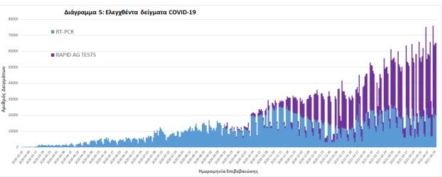Από την 1η Ιανουαρίου 2020 μέχρι σήμερα, στα εργαστήρια που διενεργούν ελέγχους για τον νέο κορoνοϊό (SARS-CoV-2) και που δηλώνουν συστηματικά το σύνολο των δειγμάτων που ελέγχουν, έχουν συνολικά ελεγχθεί 4.440.181 κλινικά δείγματα ενώ από Μονάδες Υγείας και Κλιμάκια του ΕΟΔΥ που διενεργούν ελέγχους Rapid Ag έχουν ελεγχθεί 2.939.277 δείγματα.