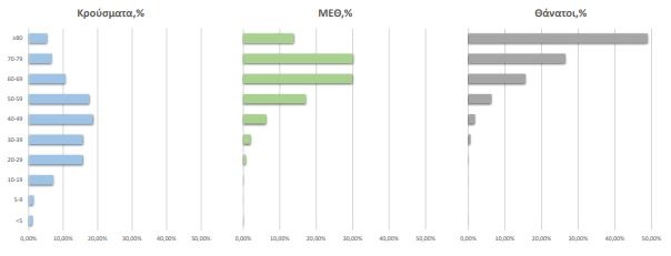 Ηλικιακή Κατανομή κρουσμάτων, νοσηλευόμενων στις MEΘ και ασθενών που απεβίωσαν από την αρχή της πανδημίας