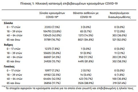 Οι νέοι θάνατοι ασθενών με COVID-19 είναι 65, ενώ από την έναρξη της επιδημίας έχουν καταγραφεί συνολικά 9.462 θάνατοι. Το 95.5% είχε υποκείμενο νόσημα ή/και ηλικία 70 ετών και άνω.