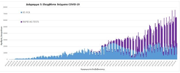 Από την 1η Ιανουαρίου 2020 μέχρι σήμερα, στα εργαστήρια που διενεργούν ελέγχους για τον νέο κορονοϊό (SARS-CoV-2) και που δηλώνουν συστηματικά το σύνολο των δειγμάτων που ελέγχουν, έχουν συνολικά ελεγχθεί 4.465.403 κλινικά δείγματα ενώ από Μονάδες Υγείας και Κλιμάκια του ΕΟΔΥ που διενεργούν ελέγχους Rapid Ag έχουν ελεγχθεί 3.003.405 δείγματα. O μέσος όρος του επταημέρου είναι 54.287 δειγματοληπτικοί έλεγχοι ημερησίως.
