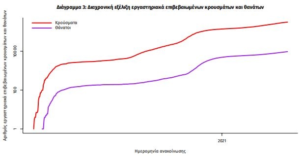 Η διαχρονική εξέλιξη των συνολικών κρουσμάτων και συνολικού αριθμού των θανάτων ασθενών COVID-19 παρουσιάζεται στο ακόλουθο διάγραμμα.